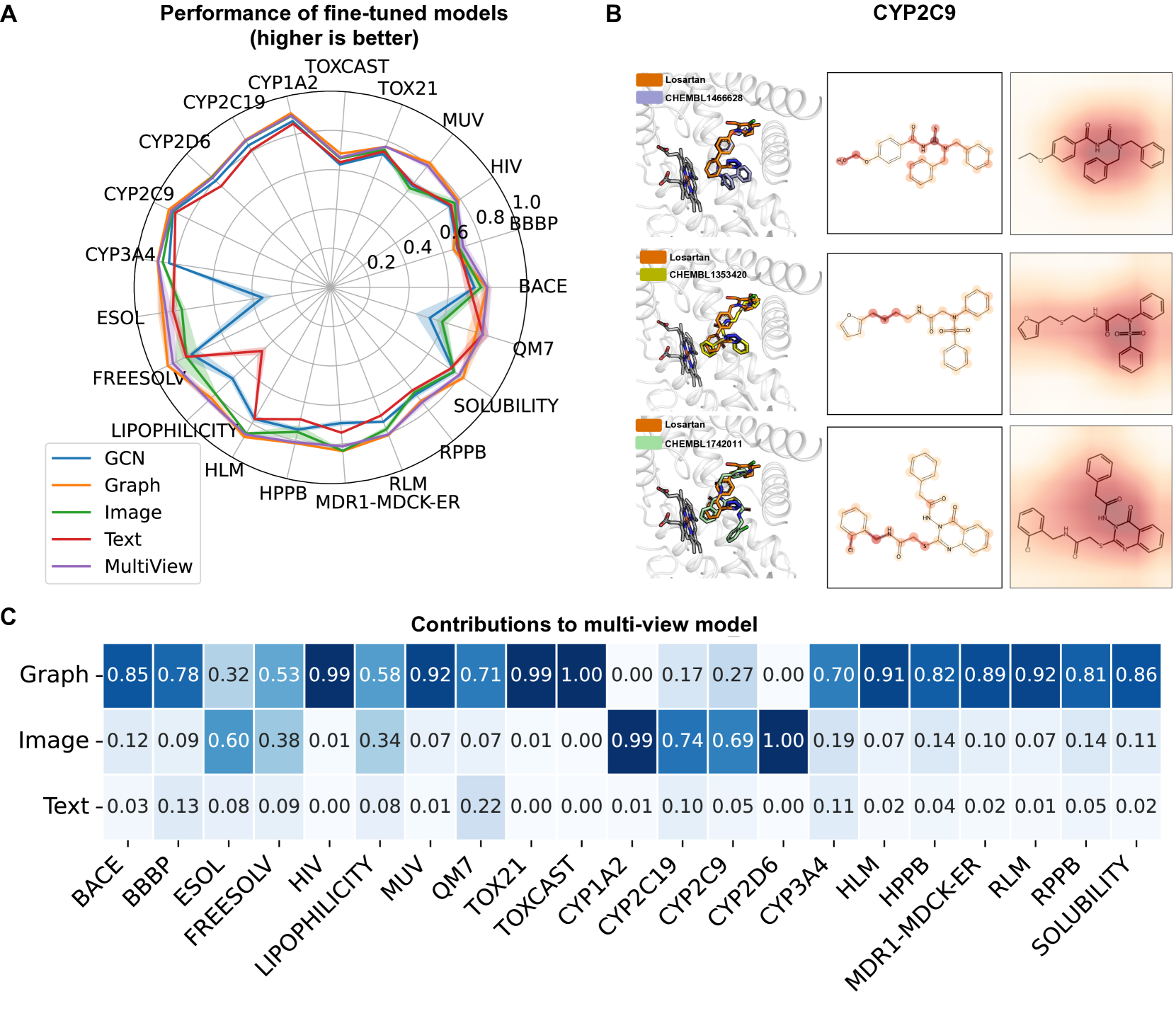 MMELON is a multi-view molecular embedding framework that fuses graph, image, and text representations in a foundation-model setting, achieving performance comparable to the best single-view models across 120+ bio-medicinal tasks, including solubility, ADME, and GPCR activity, while enabling the discovery of Alzheimer’s-related GPCR binders validated by structure-based modeling..